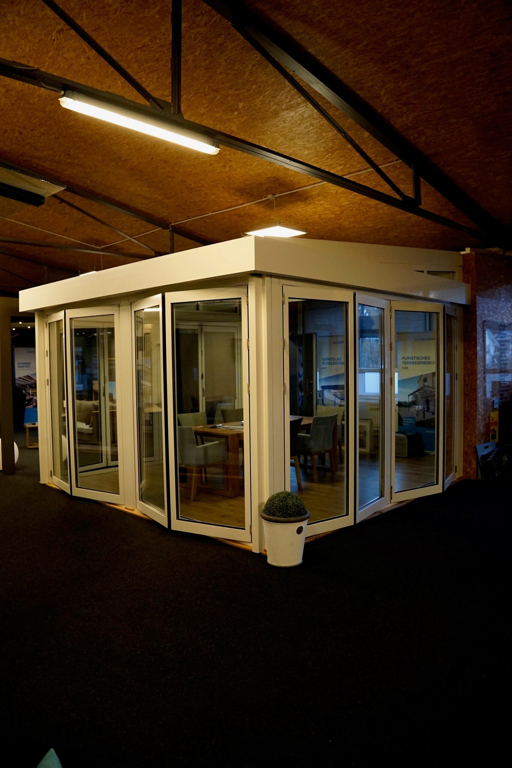Die Konstruktion ist innen und außen in Weiß ausgeführt und fügt sich harmonisch in nahezu jede Architektur ein. Die Dachneigung von 10° sorgt für optimalen Wasserablauf und eine zeitgemäße Formensprache.