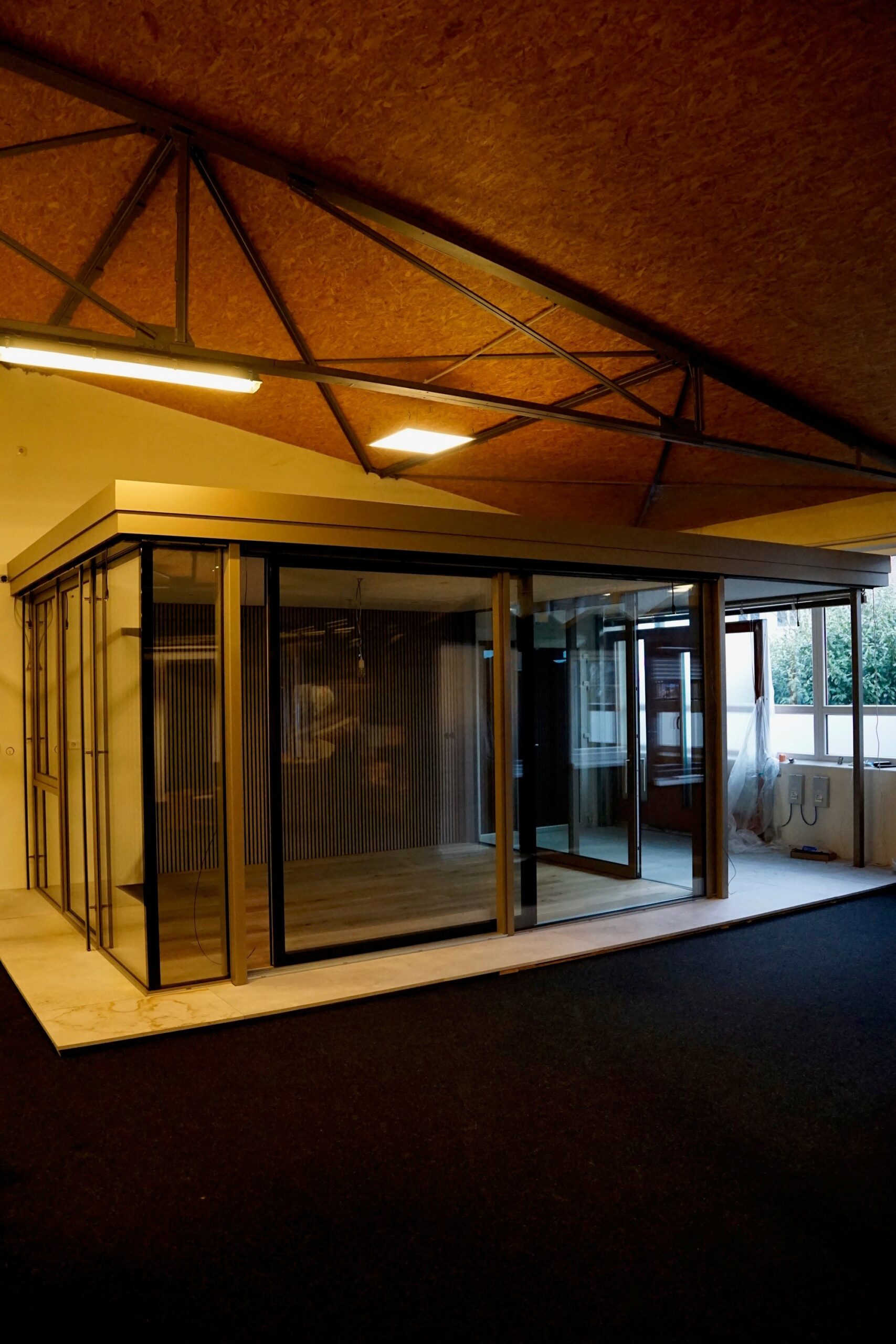 Der kubische Baukörper wirkt wie ein eigenständiger Glas-Pavillon im Raum.