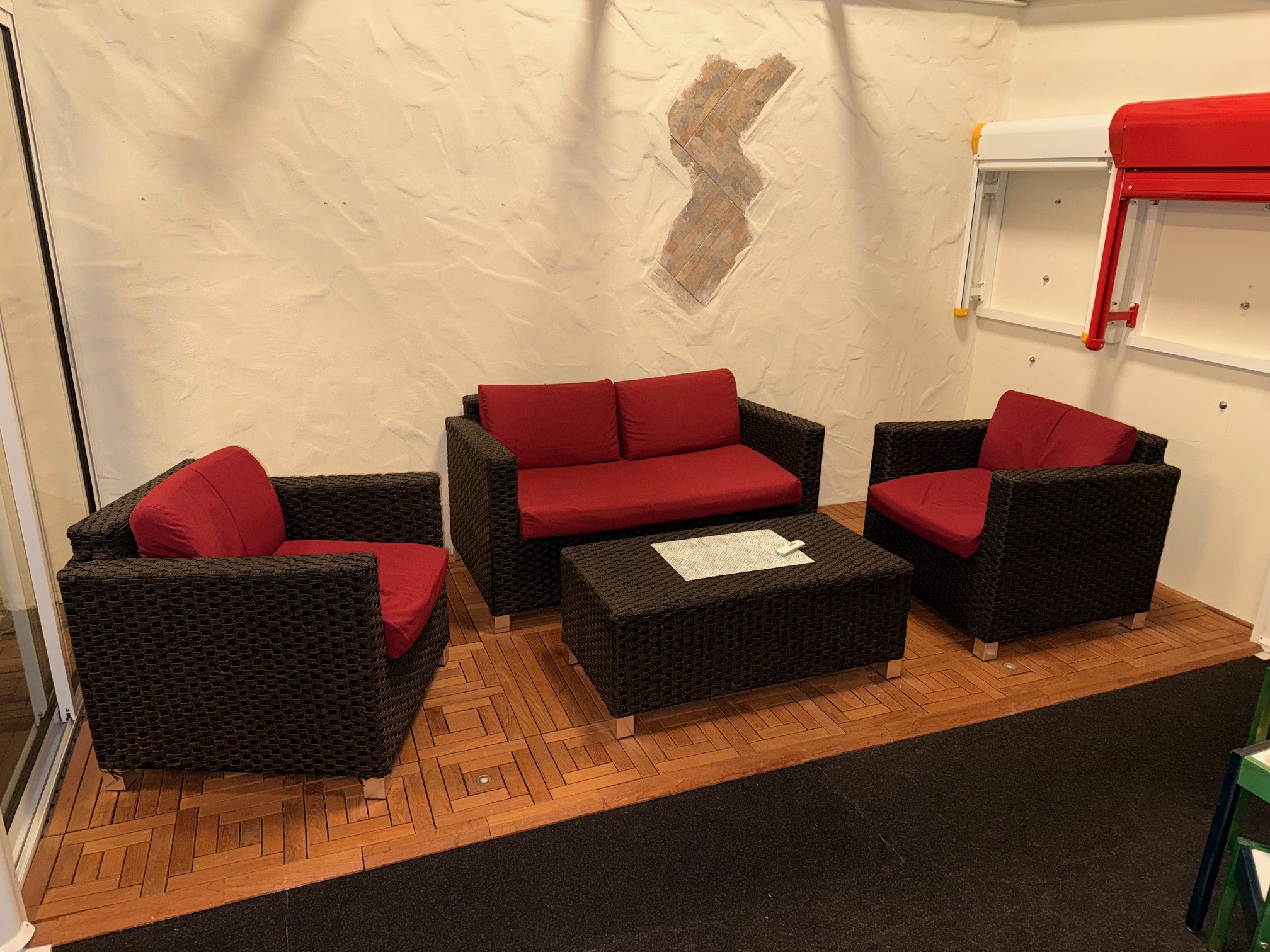 Outdoor Sitzgarnitur bestehend aus 2 Loungsesseln, einer Lounge-Couch, einem Beistelltisch sowie bequemen roten Polstern.