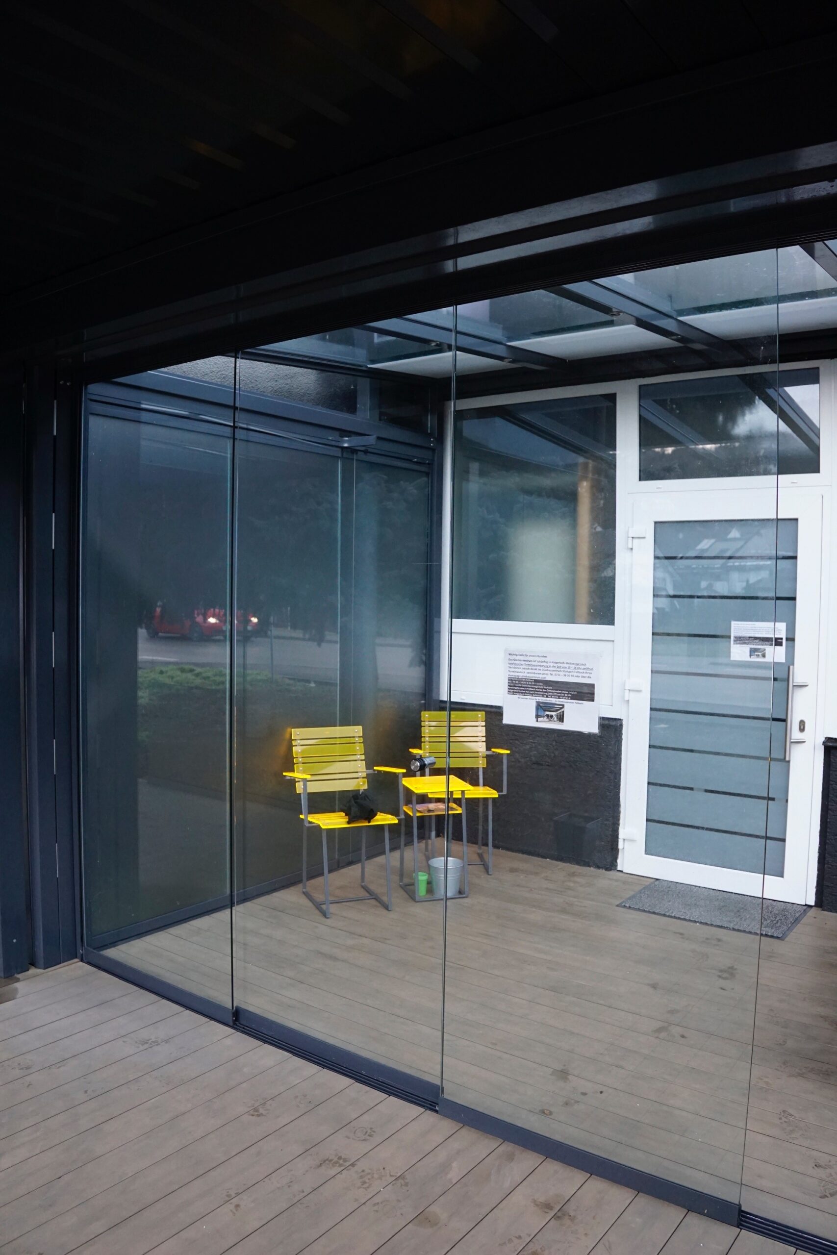 Die Kombination aus stabiler Aluminiumkonstruktion und flexiblen Ganzglas-Schiebewänden schafft einen geschützten Eingangsbereich mit maximaler Transparenz.