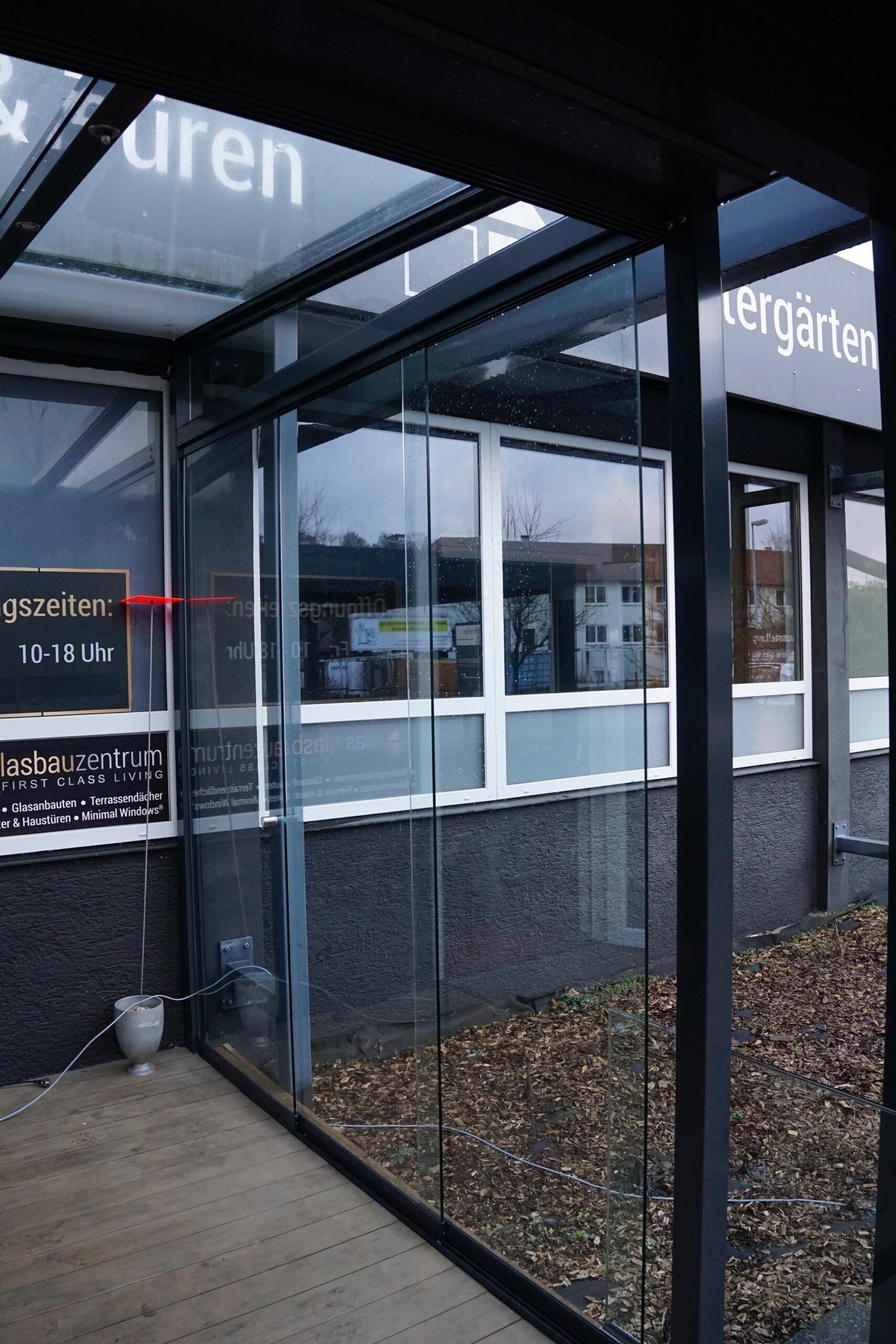 Verbaut sind hochwertige Ganzglas-Schiebewände mit mehrgleisigen Laufschienen: